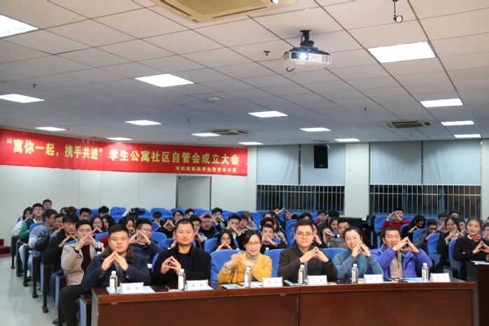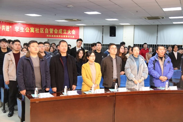 yl6809永利官网“寓你一起 携手共进”学生公寓社区自管会成立大会于12月13日晚18:30在明故宫校区A12号楼报告厅隆重召开。学院党委副书记张晓燕、学生管理办公室主任邓国伟、学管办、团委、中外合作办学、天目湖校区以及各住宿区负责的老师和全体自管会成员参加了成立大会。