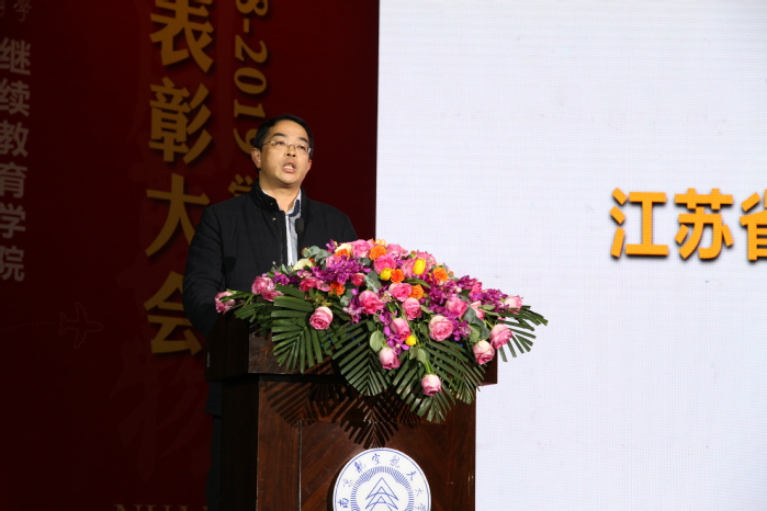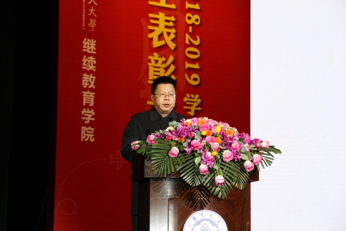 获奖学生代表事迹分享结束后,杜传锋发表讲话,向受到表彰的先进集体和个人表示祝贺、向辛勤工作在教育教学一线的广大教师和全体教职工表示感谢。他结合“努力办好继续教育事业,助力学校‘双一流’建设”的初心,通过分享校友师生榜样的事迹,从“志存高远,做奋斗者;坚守信念,做追梦人;勇于创新,做实干家”三个方面的鼓励同学们学习身边的榜样,汲取前行的力量,珍惜荣誉、奋发有为,努力为实现中华民族伟大复兴的“中国梦”作出自己的贡献!