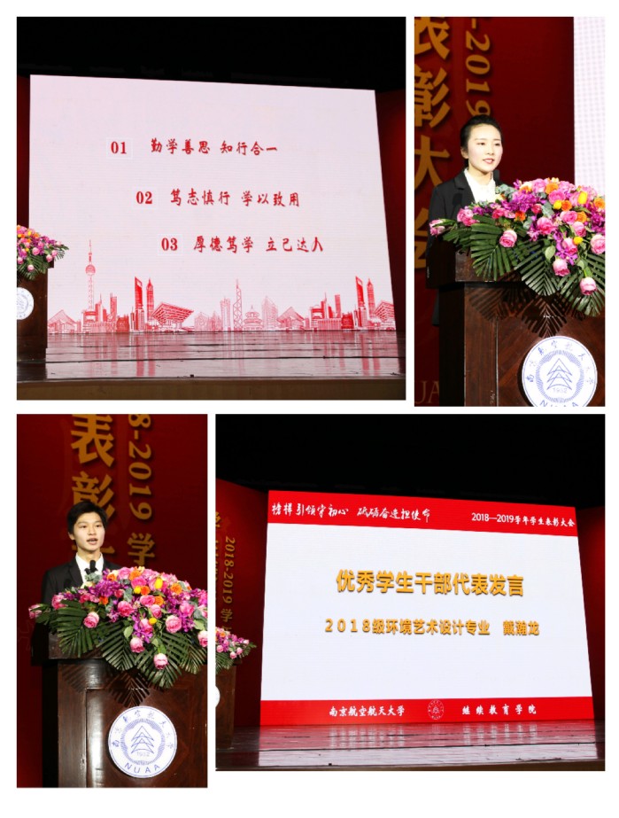 标兵班级、CZ09170302班周碧芙讲述了如何建设班委会,如何建立班级规章制度,如何打造“团结奋进、严谨求学、朝气蓬勃”的优秀班集体的做法。团队奖获得者、墨韵礼仪队代表龚思远现场分享了礼仪志愿者传承南航精神,展现学子风采,从服务校园大型赛事到省内外大型会议的初心故事。“BE ORIGINAL”科创团队代表邓浩宇结合快闪视频,讲述了团队荣获各类科技赛事奖项以及团队成长的心路历程,通过团队制作的各类科技作品展现了他们追求卓越,不断创新的优良品质。