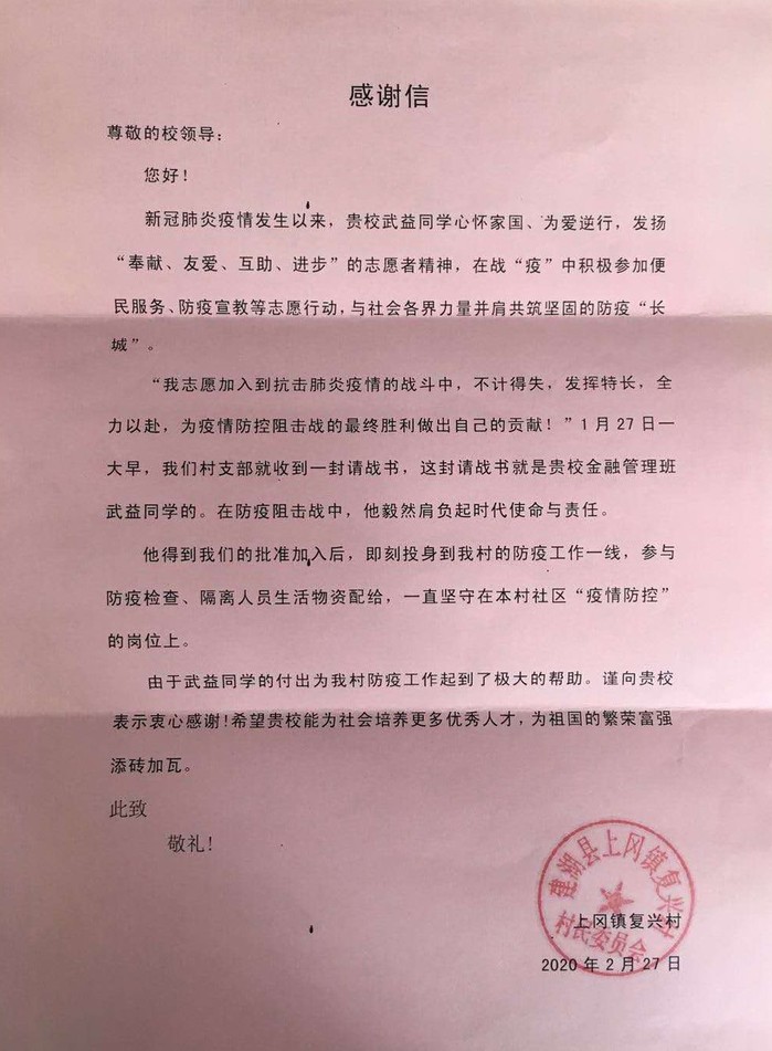 当前,全国上下众志成城,共同抗击新冠肺炎疫情。疫情就是命令,防控就是责任。在这场疫情防控战中,志愿者们默默地发挥着他们的作用,我院很多学生都投入了其中。近日,学院收到来自建湖县上冈镇复兴村的一封感谢信,信中的主人公是我院金融管理专业大一学生武益。