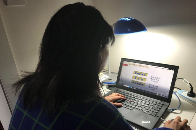 跟着包老师体验了一天的线上教学生活,我们也就几个关心的问题问了包老师。对于此次线上教学包老师也经历了从不习惯到习惯的过程,她说,“刚开始录课时,面对着电脑,而不是学生,我还有些不习惯,会紧张,录制的进度就会比较慢。为了让自己习惯起来,我想象自己是在教室里上课,在一个人的房间里录课时,我会有手势,有笑容,甚至有时忘记了是在录课,就好象是在11号楼的教室里在给学生上课一样。”
