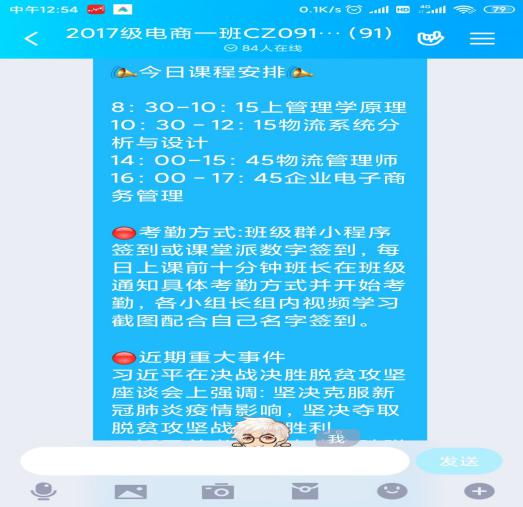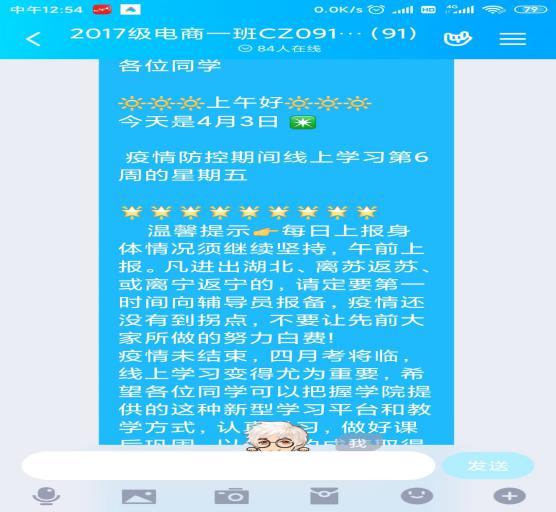 氛围引导网络发力,提高学生学习参与度。辅导员们通过建立线上学习群、举办线上班会等方式为学生提供线上学业辅导,分析、宣传学生好的做法和经验并在班级推广,让网课学风共同进步,朋辈影响互助,带动整体线上学风形成良好氛围。辅导员田邳州每天活跃在所带班级的群中,时刻保持与学生在一起,保证及时掌握学生学习信息不遗漏;他将班级同学全部细化分组,通过构建学习小组,将几人的学习任务及考勤情况落实到班委及学习小组身上,由各小组成员相互监督。当天课程开始前由学习委员在群中提醒,避免遗漏。课程完成后使用课程进度截图在群内打卡,相互交流当天的作业难点及任务完成进度,以带动少部分当日未完成学习任务的同学自觉完成,由小组百分百到课率组成班级的百分百到课率。