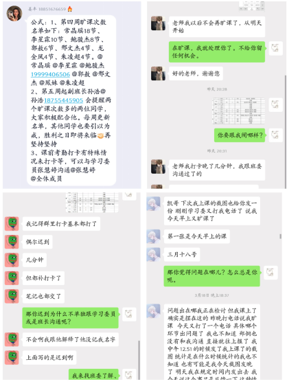 精细管理督促学业,全力促进关键少数转变。线上教学不同于线下课堂教学,辅导员能到教室关注学生的学习状态和效果,对于看不见摸不着的线上教学学习状态跟踪,辅导员只能进行更加密切的监督。对于一些上课经常迟到、请假次数多、挂科多的学生,辅导员刘凯就采取了更加细致地措施,来检查和督促他们的学习状态和效果。他每日抽取3-5人,抽查课堂笔记和课后测验,并联系家长一起督促学生学习,做的好的给予表扬鼓励,做的不好的及时通报反馈,督促自律性不足的学生跟上线上学习进度。