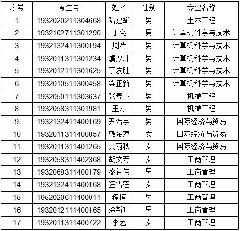 根据《省教育厅办公室关于做好2020年全省成人高等教育新生复查及学籍电子注册工作的通知》(苏教办学函[2020]4号)、 《南京航空航天大学成人高等教育学生学籍管理办法》的相关规定,我校2020年新生入学注册工作中有17位学生未按规定期限办理入学手续,并明确表示放弃入学资格。现我院拟对下述学生作放弃入学资格处理,现将名单予以公示(详见下表)。