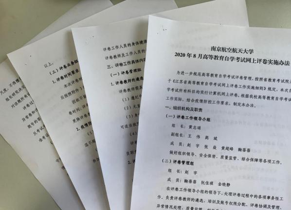 针对此次评卷的两大变化:一是评卷数量和新评卷教师大幅增加,二是疫情防控要求,学院制定了《南京航空航天大学2020年8月高等教育自学考试网上评卷实施办法》,专门成立了评卷工作领导小组,对整个评卷工作进行了周密安排和科学部署,重点进行评卷前教师培训和协调会,部署评卷期间的各项保障工作。
