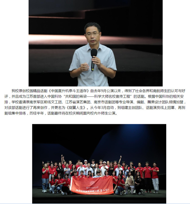 本次话剧,我院2017级广播电视学专业江天翔和2018级交通运营管理专业李云飞参演其中,两位同学带着对主人公的崇敬、对话剧的热爱积极参加排练。他们认为,这不仅是一次令人难忘的体验、更是一次南航精神的传承,让他们在未来的学习道路上有更足的动力和信心,乘风破浪、勇往直前。 在两位同学的排练过程中,学院一直关注他们的排练和学习情况,鼓励他们要向王适存先生一样有战胜困难的能力和勇气,有勇于攀登的精神和毅力,有报国之志和强国之心。