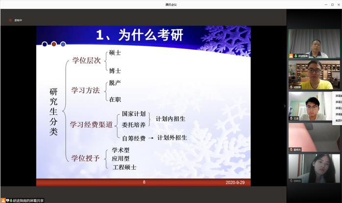 本次讲座持续一个半小时,有150余名学生参加。肖教授的讲座贴近现实,举例丰富,让同学们受益匪浅。答疑环节,同学与肖教授线上面对面提问,肖教授对同学们考研途中存在的疑问及困惑进行了阐释与解答,尤其是同学们最关心的如何择校选专业,如何准备研究生各阶段考试,如何安排学习时间等问题提出了很多很好很实用的建议,为同学们指明了考研准备的方向。