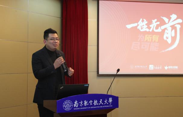 讲座伊始,刘鹏作为南航金城学院的校友,以生动丰富的个人求学和工作经历为案例,向同学们讲解了大学生活该如何度过、如何权衡好学习和兴趣以及职业的发展如何规划等内容。刘鹏鼓励同学们,在未来的学习和就业中,每个人都要定好自己的学习目标,找到自己的独特优势或者兴趣点,放手一搏,坚持不懈,认真地去研究它,去为之而努力。