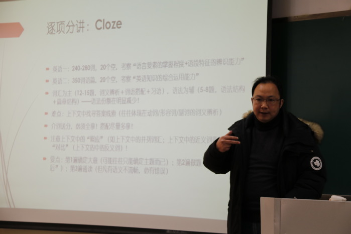 接着,徐源老师为同学们进行了考研英语培训。徐老师从复习备考内容、学习方法、答题技巧等方面讲授单词构成、语法知识、阅读逻辑等英语高效备考知识。他还向同学们提出考研英语分数的理想期望,让同学们有一个奋斗目标。徐副教授还很贴心地给同学们留下了英文写作的作业,可以一对一的进行考前重点复习内容的交流。这次英语培训不仅提高了同学们对英语学习的认识,也增强了对学习英语的信心。