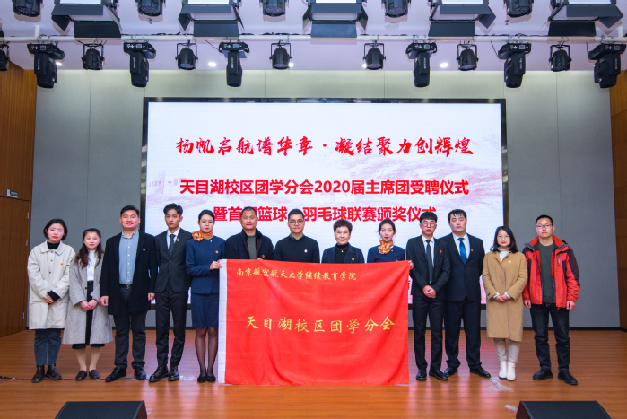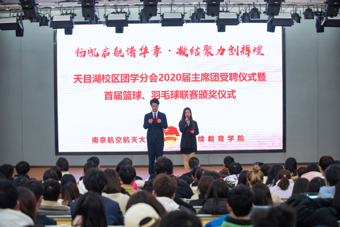 12月17日下午,学院天目湖校区团学分会2020届主席团受聘仪式暨“‘羽’你同行,‘篮’不住的激情”首届篮球、羽毛球联赛颁奖仪式在巡天楼二楼报告厅举行。学院团委书记邓国伟、驻校区办公室主任刘岚、团委副书记李学东、驻校区办公室副主任陈圆平、驻区辅导员以及团学分会、团支部代表参加仪式。