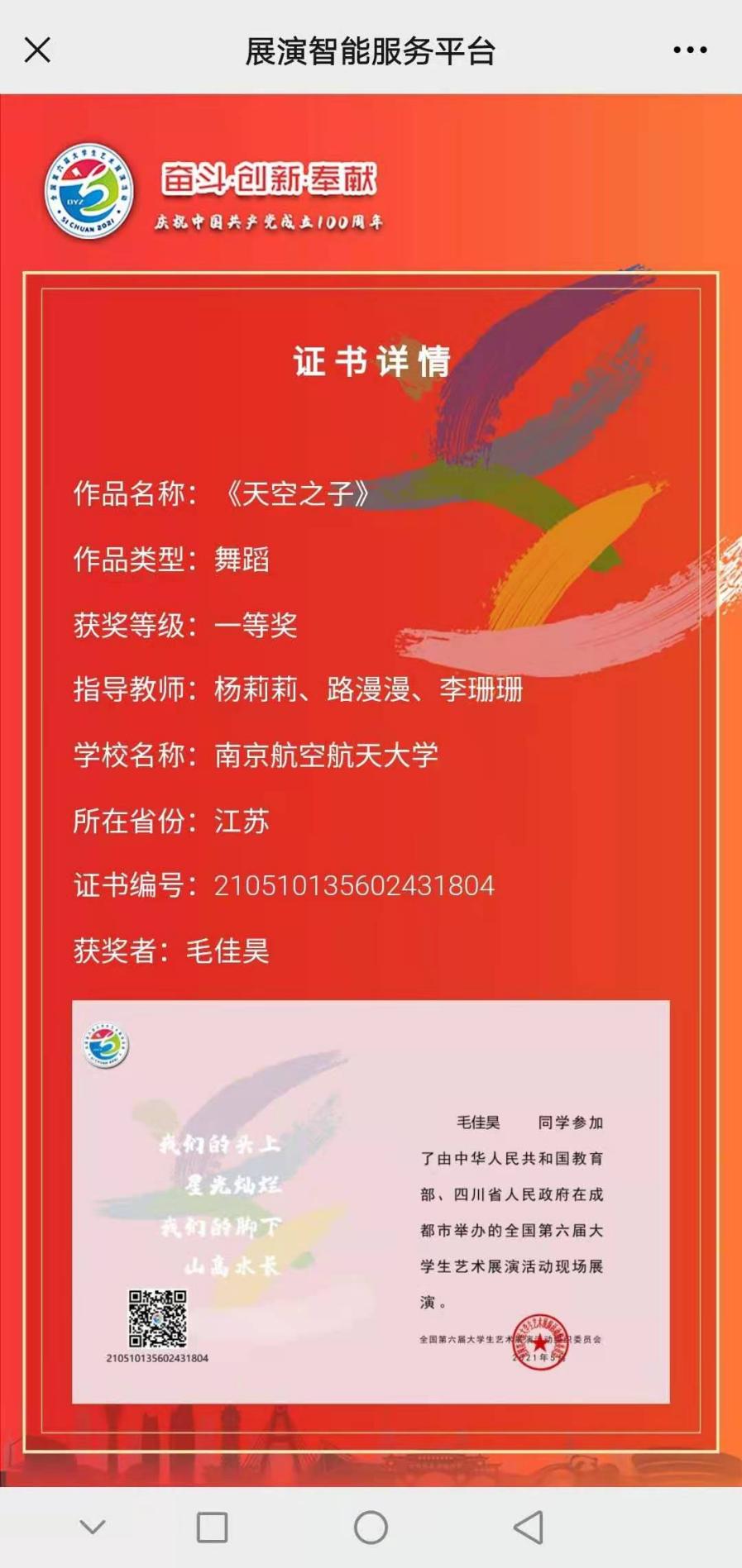 2021年5月13日,由教育部和四川省人民政府主办,四川省教育厅和成都市人民政府承办的全国第六届大学生艺术展演活动在成都落下帷幕。我院天目湖校区2019级交通运营管理专业学生毛佳昊同学参演的学校选送原创舞蹈作品《天空之子》在本次展演活动中荣获一等奖。
