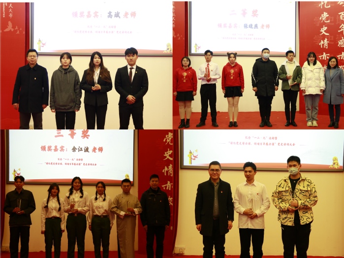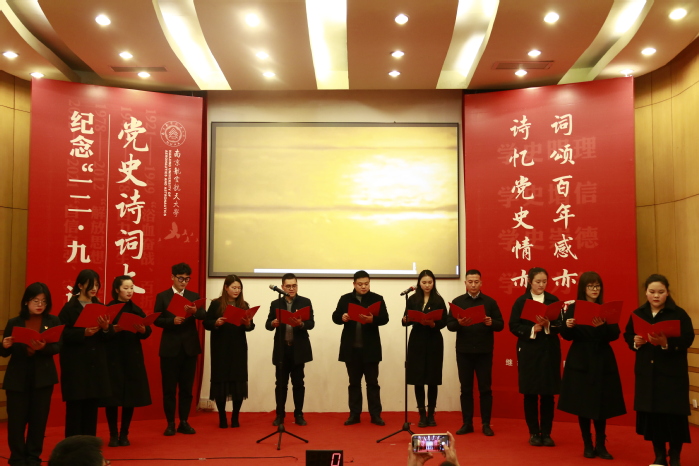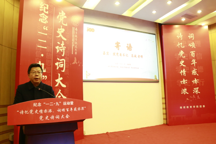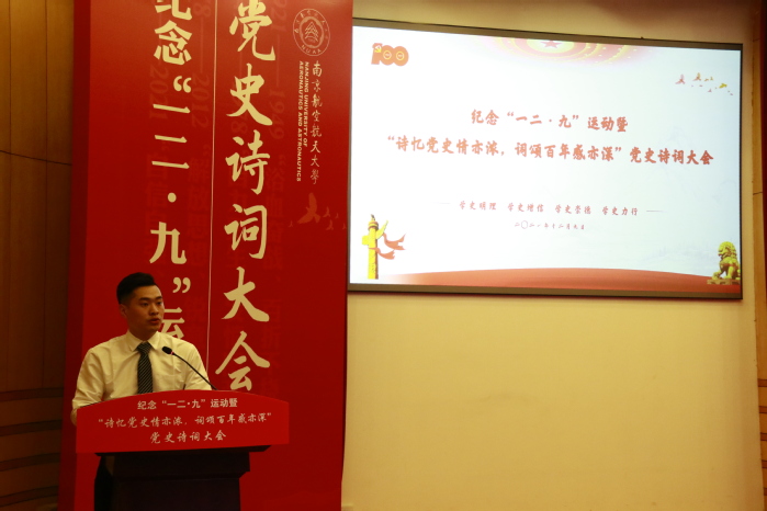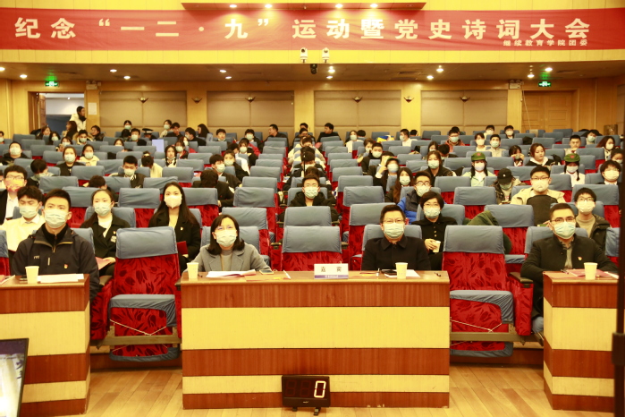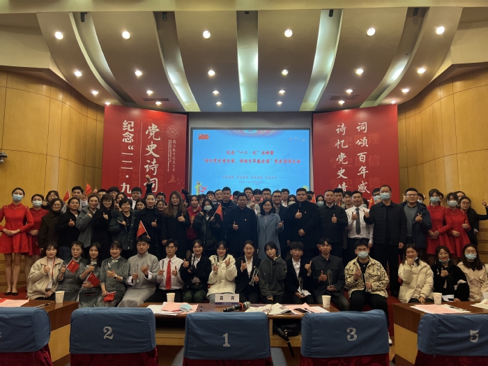 为深入学习贯彻党的十九届六中全会精神,以纪念“一二•九”运动86周年为契机,将党史学习教育同中华优秀传统文化相结合,增强党史学习实效,12月9日晚,学院团委在明故宫校区逸夫科学馆报告厅举办纪念“一二•九”运动暨“诗忆党史情亦浓,词颂百年感亦深”党史诗词大会,学院党委书记高斌、副书记张晓燕,学院机关党支部书记、组织员余江波,学生管理办公室主任、团委书记邓国伟以及学生党支部、学管办、相关辅导员老师,团学组织骨干、团支部代表等参加了活动,活动由团委指导老师刘凯主持。