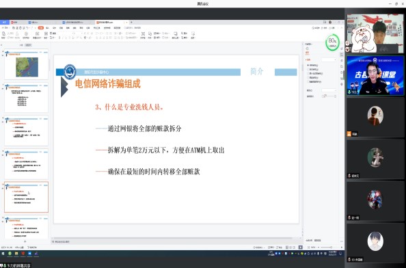3月10日-11日,各班级采用线上、线下不同形式召开反诈防骗主题教育班会。班会邀请古县街道派出所副所长虞俊、卞力,民警强浩、王淦开展防范电信网络诈骗专项讲座,通过法律知识宣讲和典型案例分析,具体介绍常见网络骗术,教授反诈应对措施,同学们纷纷表示有很大收获。