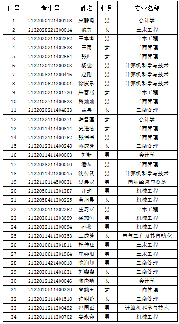 根据《省教育厅办公室关于做好2022年全省成人高等教育新生复查及学籍电子注册工作的通知》、 《南京航空航天大学成人高等教育学生学籍管理办法》的相关规定,我校2022年新生入学注册工作中有34位学生未按规定期限办理入学手续,并明确表示放弃入学资格。现我院拟对述学生作放弃入学资格处理,现将名单予以公示(详见下表)。