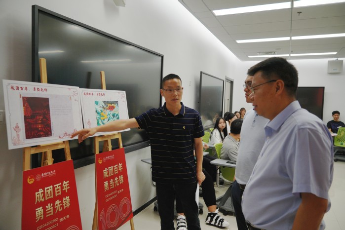 为了广泛发动青年团员深入学习践行总书记在大会上的重要讲话精神,引导同学们锤炼本领,提高综合素质,在活动筹备期间,团支部团员代表结合专业特色设计和创作了十余幅“庆祝建团百年”主题海报、书法等艺术作品,并在活动现场进行了集中展示。