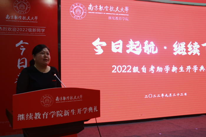 典礼第二阶段,副院长赵宇对新生进行了专业学习教育。她围绕“德、智、体、美、劳”五个方面,结合学院学生培养的特点,从自考助学项目的性质和专业课程等方面,详细、生动地向新生解读了在大学,应该“学什么”“怎么学”的问题,赵院长鼓励同学们脚踏实地,懂得坚持,学会规划,早日成为高层次、高技能、高素质的实用型人才。