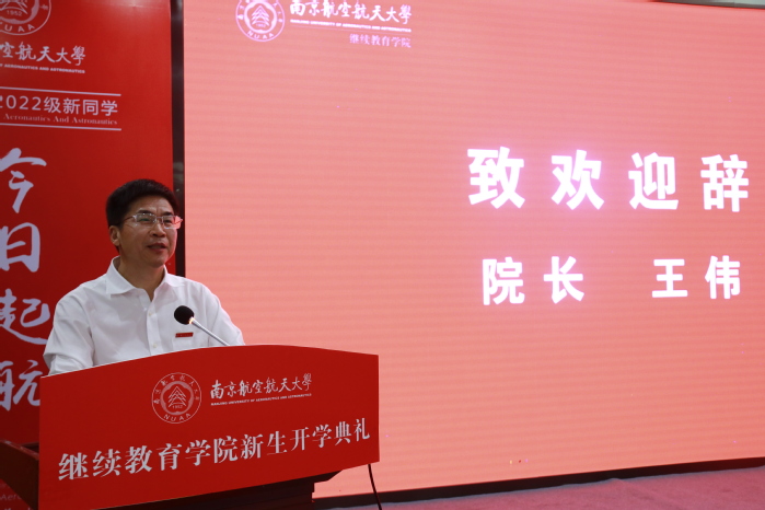 院长王伟致欢迎辞。王院长向2022级新同学表示了热烈欢迎。他向全体新生介绍了学校的总体概况和学院发展情况,并向新生提了要求和希望:希望全体新生志存高远,坚定理想信念;励学精技,夯实专业基础;自强自立,勇敢面对挑战;严以律己,坚持高标准、严要求。王院长还勉励同学们,要倍加珍惜在南航的时光,不负韶华,刻苦钻研,勇攀高峰,学院也将不遗余力地为同学们成长成才、全面发展提供最大最好的舞台。