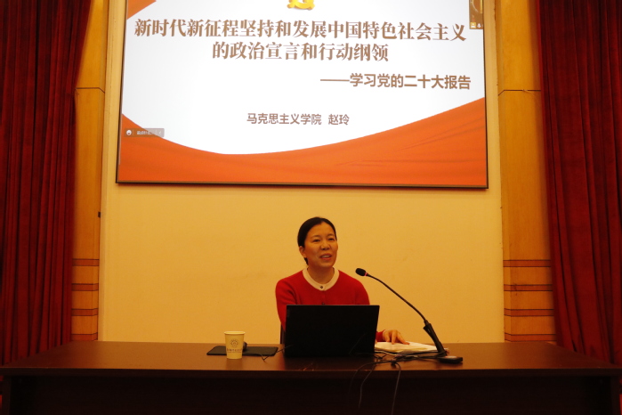 赵玲老师以《新时代新征程坚持和发展中国特色社会主义的政治宣言和行动纲领》为题作了精彩报告。她首先回顾了党的二十大会议的全过程,围绕“过去五年的工作和新时代十年的伟大变革”“开辟马克思主义中国化时代化新境界”“新时代新征程中国共产党的使命任务”“贯彻新发展理念是新时代我国发展壮大的必由之路”四个方面进行了深入解读,她用生动的语言、丰富的案例、详实的数据全面阐述了开辟马克思主义中国式时代化新境界、中国式现代化等重大理论和实践问题,她指出,党的二十大报告描绘了全面建设社会主义现代化国家、全面推进中华民族伟大复兴的宏伟蓝图,为新时代新征程党和国家事业发展、实现第二个百年奋斗目标指明了前进方向、确立了行动指南。她表示,青年学生要坚定不移跟党走,将个人理想与成长融入时代发展的潮流中,敢想敢为,善作善成,立志通过不断努力成为堪当民族复兴重任的时代新人。
