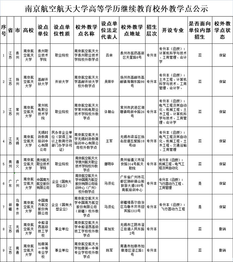 根据《省教育厅办公室关于开展高等学历学院自查和校外教学点备案工作的通知》(苏教办高函〔2022〕25 号)要求,现将南京航空航天大学高等学历学院校外教学点进行公示: