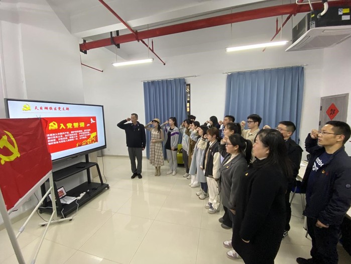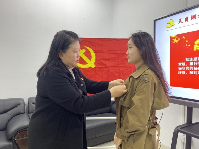 为进一步教育引导新发展党员同志铭记入党初心,强化党员意识,坚定理想信念,在换届选举大会后,党支部紧接着举行了新党员入党宣誓仪式。新党员面向鲜艳的党旗,举起右拳,在杜传锋同志的领誓下,向党和人民许下了庄严承诺。学院党委副书记尹春苹为新发展党员佩戴了党徽。