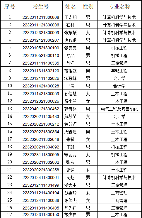 根据《省教育厅办公室关于做好2023年全省成人高等教育新生入学资格复查及学籍电子注册工作的通知》、 《南京航空航天大学成人高等教育学生学籍管理办法》的相关规定,我校2023年新生入学注册工作中有27位学生未按规定期限办理入学手续,视为放弃入学资格。对于逾期未报到者,在教育部学信网不予注册学籍,并在学信网进行放弃入学资格标注,以后不再恢复学籍。现将名单予以公示(详见下表)。