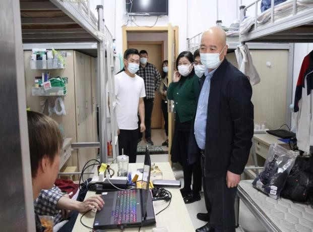 走访过程中,刘建成书记在了解学生宿舍生活和学习情况的同时,就宿舍安全、防火防盗等工作向同学们进行了提醒,并就毕业情况和学生进行了沟通交流。王伟院长对学生五一假期的出行、安全等问题进行了关心和叮嘱,并且针对不同宿舍区的学生上课交通问题给同学们进行了提醒。尹春苹副书记对近期疫情形势向同学们作了强调,提醒同学们要高度重视,做好科学防护,并对学生的宿舍卫生提出了具体要求。
