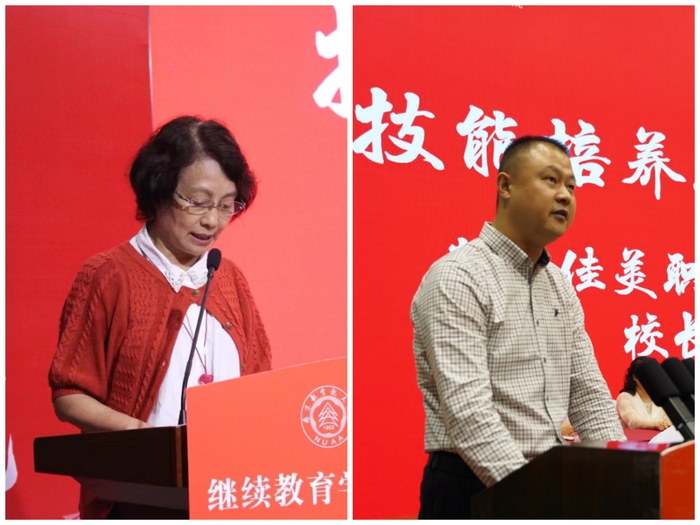 技能培养单位代表,知金教育咨询江苏有限公司总经理沈春颖女士、南京佳美职业技能培训学校校长陈豹先生从技能培养单位的角度,为同学们介绍了“学历+技能”的培养模式和实践经验,希望同学们充分利用学习资源,加强技能训练,早日成为专业知识强、技能水平高、综合素质过硬的优秀人才。
