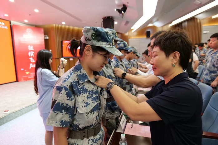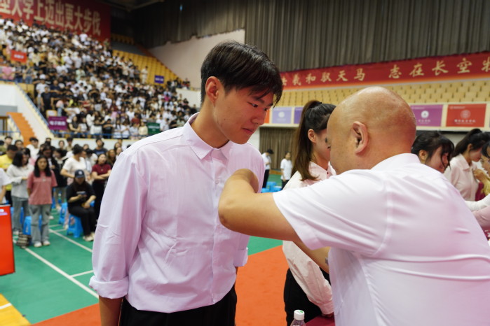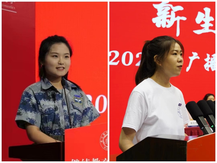 典礼上,学院领导和嘉宾为新生代表佩戴校徽,宣告新生正式成为一名南航人。新生代表章焱、李柯辰同学上台领誓,现场同学们举起右拳,发出了作为南航学子的铿锵誓言。2023级交通运营管理专业陈珂珂、2023级广播电视学专业曹雨霏作为新生代表发言,她们表示,要在南航的大学生涯中,进一步坚定理想信念、坚持勤奋刻苦、积极融入校园,做一个合格的南航人。