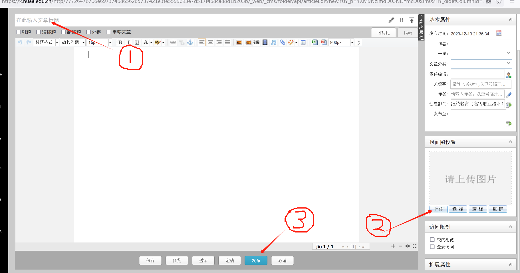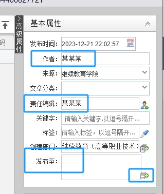 15.直到最终显示没有问题后,填写右边“基本属性”,需填写“作者”“来源”“责任编辑”“审核领导”和“发布至”(如果稿件只是在一个栏目里发布,则无需填写,如果在多栏目发布,则选择后面的加号增加栏目)(“作者”填实际稿件投稿人,“来源”填“yl6809永利官网”,“责任编辑”填上传人姓名。)
