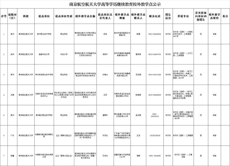 根据《省教育厅办公室关于开展高等学历学院自查和校外教学点备案工作的通知》(苏教办高函〔2023〕32 号)要求,现将南京航空航天大学高等学历学院校外教学点进行公示: