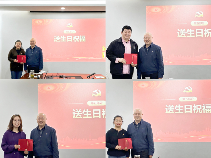 活动第三部分:“送”一次生日祝福——激励担当,“品”一个生日蛋糕——感受温暖。邀请学院党委书记刘建成同志为四位过“政治生日”的党员送上“生日贺卡”,贺卡上写着党员的姓名、党龄、入党誓词和对每位同志的激励和祝愿,全体同志一起分享了专属蛋糕。通过共度“政治生日”,体现着党组织对于同志的关怀和温暖,并意在提醒党员同志们时刻不忘党员身份,牢记初心使命。