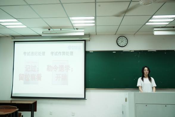 会议伊始,全体人员观看了《诚信考试教育》宣传短片。随后,学生联合会常委陈靖同学领学学校和学院有关考试的规章制度和考场规则,提醒同学们要严格遵守考风考纪,并结合实际案例对考试违纪的严重后果进行了讲解。