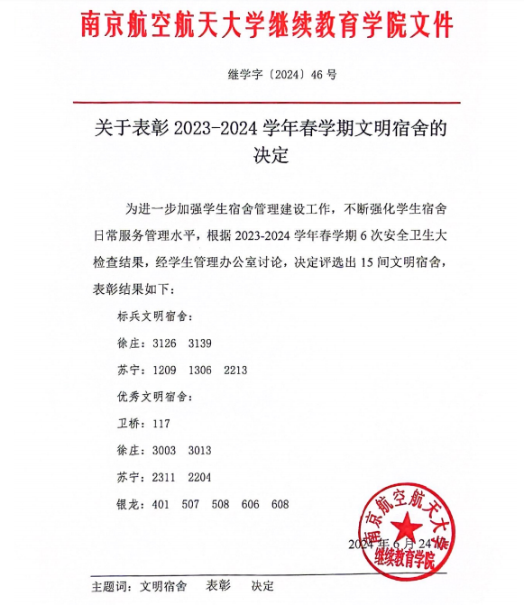 yl6809永利官网关于表彰2023-2024学年春学期文明宿舍的决定