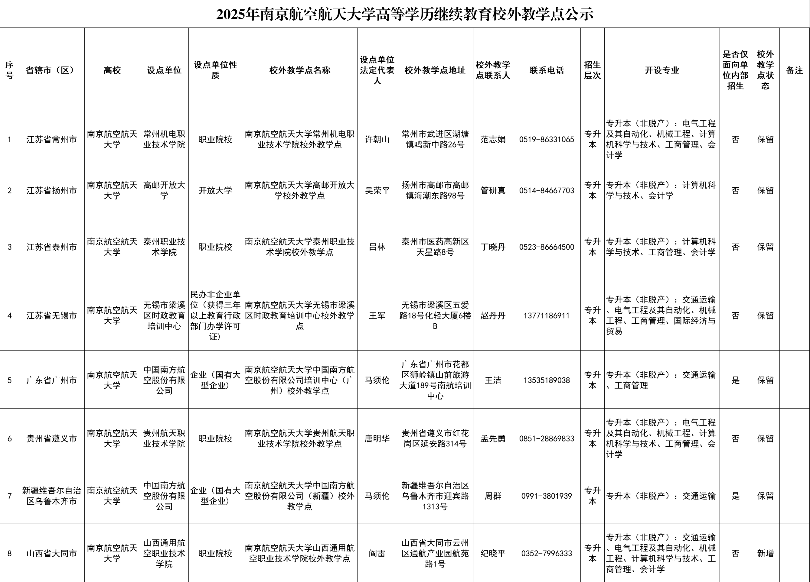 根据《教育部办公厅关于严格规范高等学历学院校外教学点设置与管理工作的通知》(教职成厅〔2022〕1号)要求,现将2025年南京航空航天大学高等学历学院校外教学点进行公示: