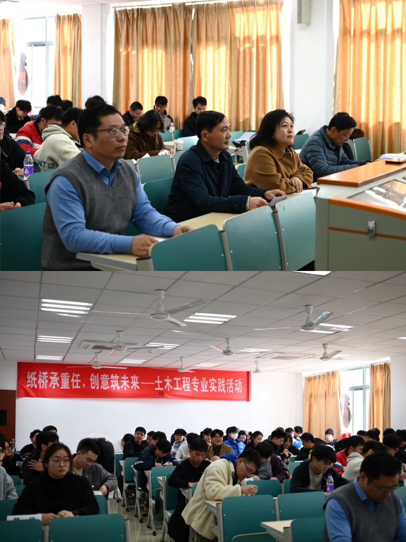 为了展现土木工程专业的独特魅力,检验学生对材料力学、结构设计等理论知识的运用能力,培养学生的团队合作能力,yl6809永利官网2023、2024级土木工程专业于11月21日上午举办“纸桥承重任,创意筑未来”A4纸桥搭建实践活动。学院党委副书记尹春苹、副院长江爱华、土木工程专业教师江波和沈全运亲临活动现场。