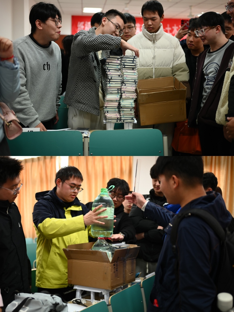 经过一个多小时紧张而专注的设计和制作,各支队伍完成了他们的纸桥作品。这些作品不仅是桥梁结构的实体,更是团队智慧和合作精神的体现。同学们兴奋地展示着他们的成果,现场气氛紧张而热烈。随着一本本书、一桶桶水被放置在纸桥上,纸桥开始接受承载能力的极限测试,每一次轻微的颤动都牵动着在场每个人的心。最终,有三组团队的纸桥以其出色的承重能力脱颖而出。