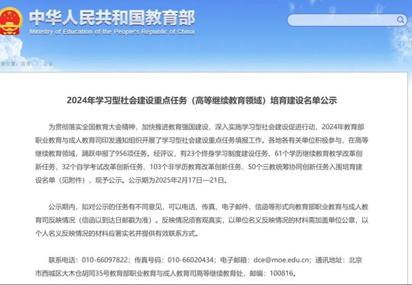 近日,教育部职业教育与成人教育司公示了2024年学习型社会建设重点任务(高等继续教育领域)培育建设名单。我校申报的《构建“三融五跨”人才培养模式,推动自考专业建设及课程体系改革》项目,成功入选自学考试改革创新任务。