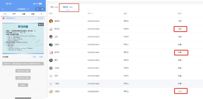 应用外语系徐源副教授先行先试,积极探索《大学英语》的“1+X”课堂教学设计,构建“课前-课中-课后”全场景教学模式。课前推送音频、视频预习资料,助力学生提前熟悉内容;课上通过答题、弹幕互动,激发学生参与热情,营造活跃氛围。3月29日上午,徐源老师在南航本部的实时课堂同步向新疆、贵州、广州等教学点成教师生开放,演绎了一场3000人跨越时空、共上一门课的精彩画卷。因工作原因错失上课的学生通过直播回放接续学习,有效弥补工学矛盾带来的遗憾。学习期间,通过点击某页PPT上的“不懂”按钮,精准定位学习薄弱环节,有助于及时查漏补缺。这一创新实践不仅推动优质教育资源的跨区域共享,更开创了“校本部引领、多区域联动”的高等学历学院的教学组织新范式,为破解成人教育地域壁垒、解决成人工学矛盾提供了可复制的南航方案。